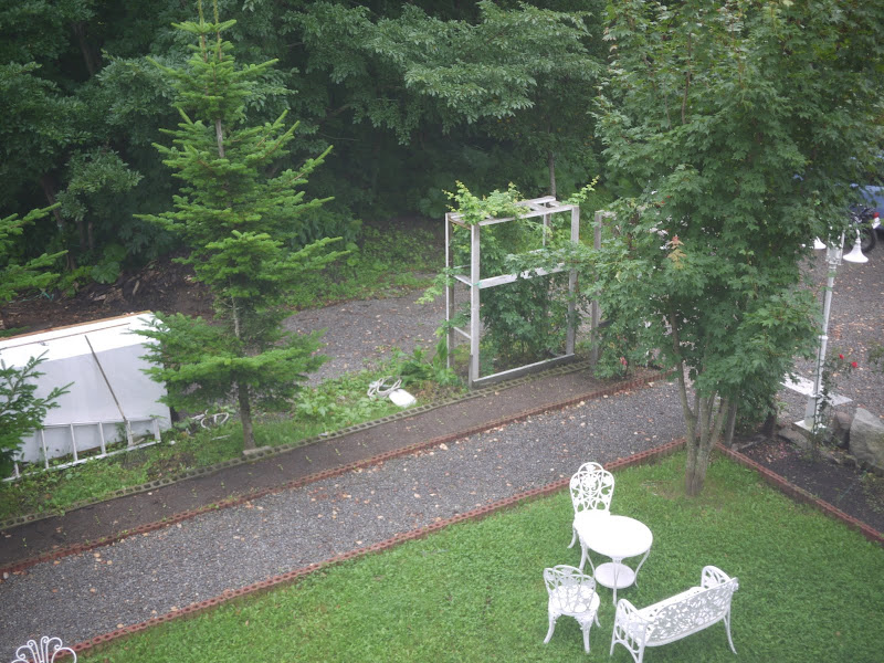 かわいそうなことに、昨晩ずっと雨ざらしになったGT1000フクピカの効果があって、水をはじいていました。ペンションの庭は紺に素敵なイングリッシュガーデン風です。